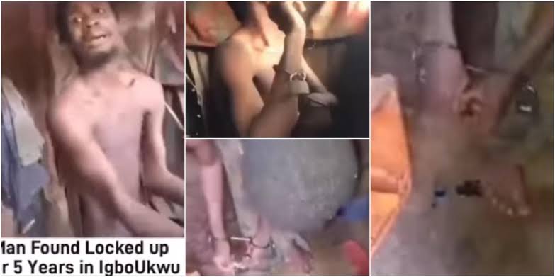 Residents of Etiti village in Igbo-Ukwu, Anambra State, were stunned after a young man, Chigbo, was discovered chained inside a hut for five years by his family.