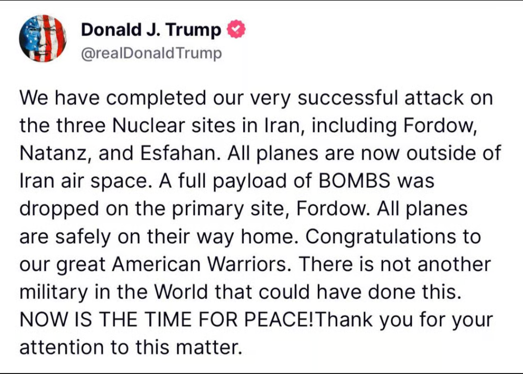 In a tweet posted on his official account, Trump wrote: “We have completed our very successful attack on the three Nuclear sites in Iran, including Fordow, Natanz, and Esfahan. All planes are now outside of Iran air space. A full payload of BOMBS was dropped on the primary site, Fordow. All planes are safely on their way home.”