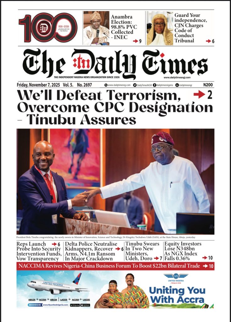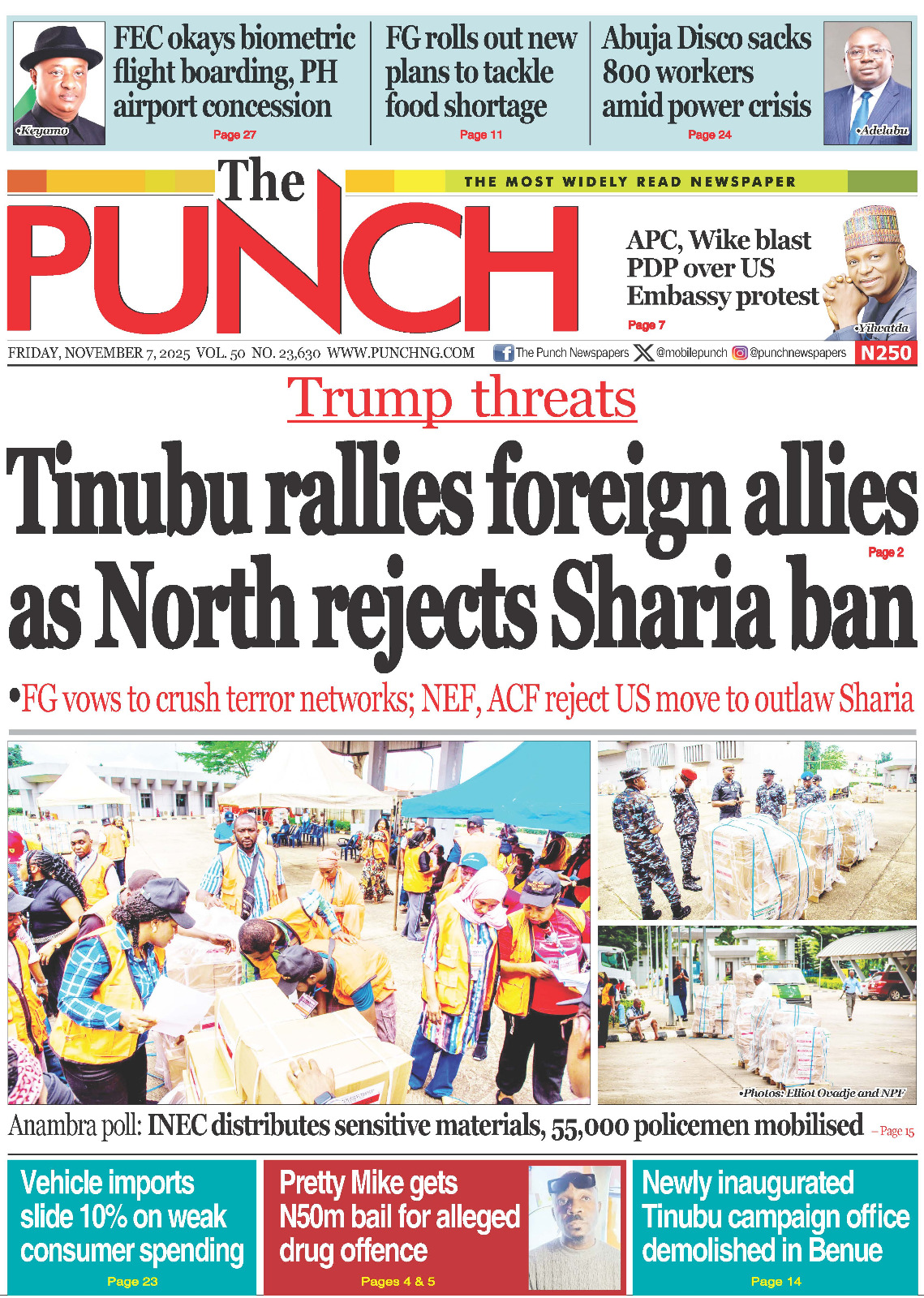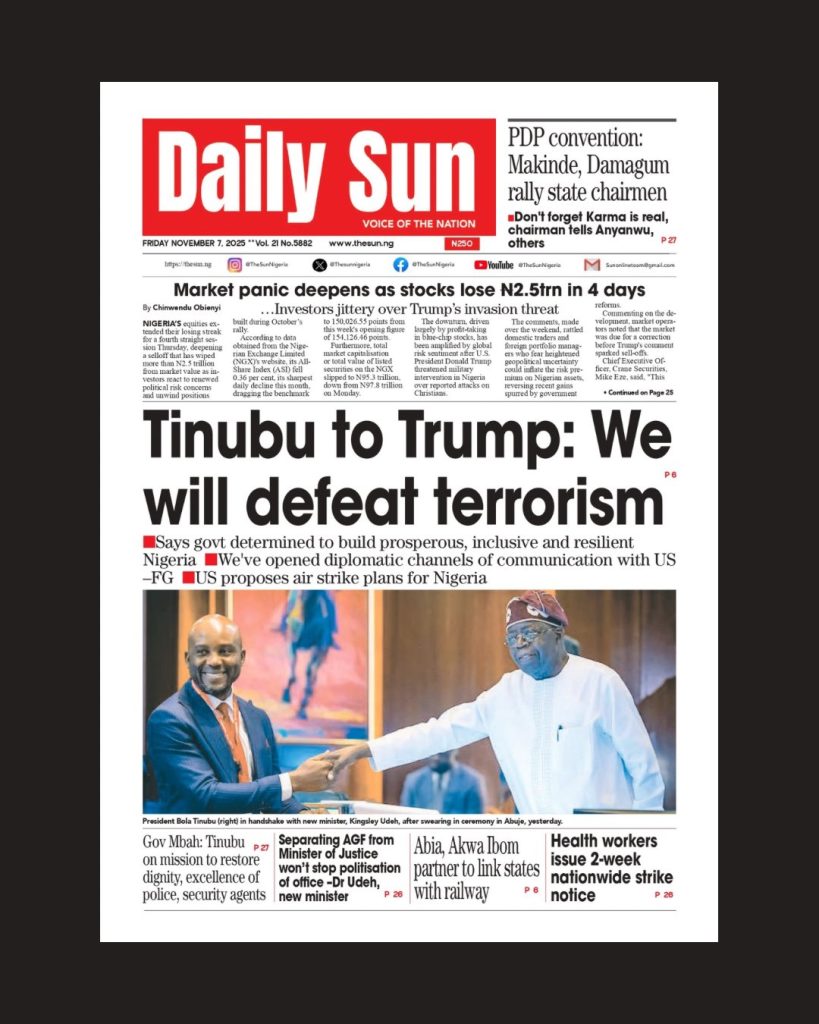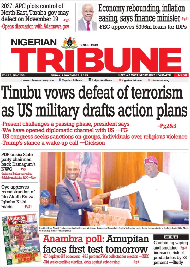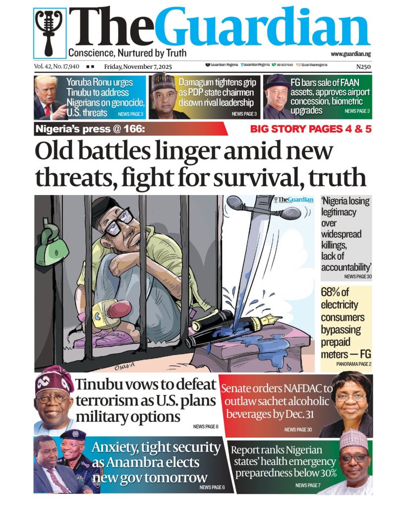 FRONT PAGES: Nigerian Newspapers – 07 November 2025 November 7, 2025 Share: Bookmark this story Save For Later Join Our Community to get Live Updates Join our WhatsApp Channel Follow our Telegram Channel Related Posts Nigerian Newspapers – Summary Notes: 25 MAR 2025 FRONT PAGES: Nigerian Newspapers – 02 MAY 2024 Nigerian News: Morning Headlines – 09 September 2025