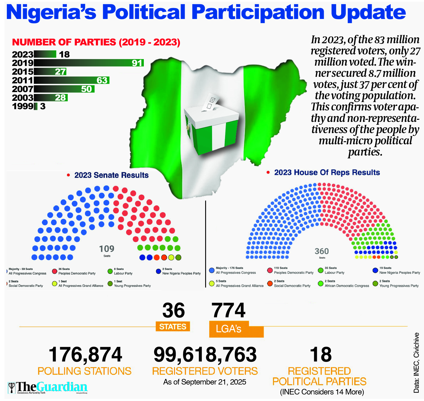 INEC spokesman Rotimi Oyekanmi said, “The issue is fundamental, and I will need more time to address it appropriately. You can go ahead, and we will do a follow-up on it.” Former ambassador Dr. Yemi Farounbi warned that “the lack of core ideas and values makes all of them look alike,” arguing that parties without ideology offer voters no real choice. University of Ibadan scholar Prof. Adewale Yagboyanju described dormant parties as “nothing but a distraction,” while analyst Prof. Femi Ajayi said too many inactive groups “make democracy a joke.” Conversely, Middle Belt Forum president Bitrus Porgu insisted “the more the parties, the merrier,” stressing that only the National Assembly can regulate registrations.