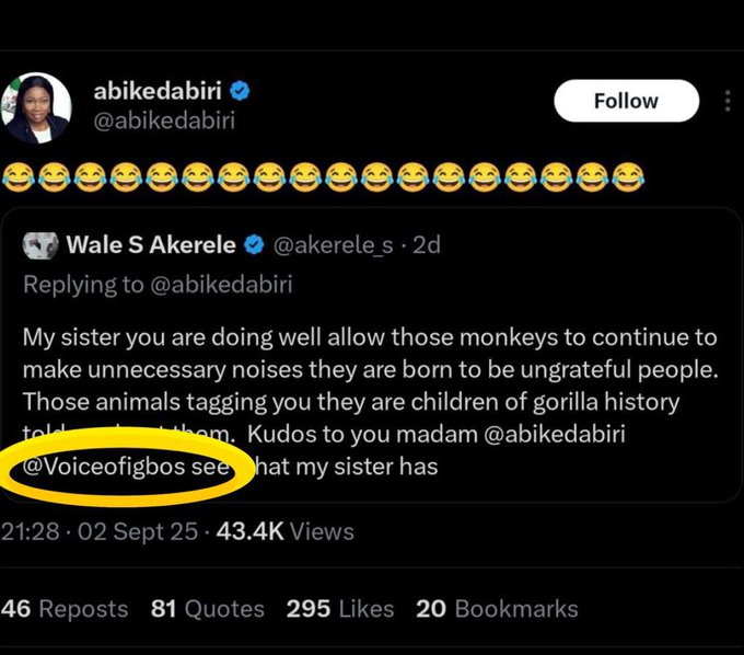 If anyone should be called out, it’s the man who wrote the insulting words. But what did they, including you, do? You guys mysteriously ignored the real source of the insult and shifted the entire weight of blame to @abikedabiri just because she added laughing emojis. That is nothing but deliberate mischief. & let’s not pretend we don’t know how online narratives are spun in this country. Some people are always waiting for the slightest opportunity to tag her as anti-Igbo, even when the facts don’t support it. It’s dishonest, and it’s dangerous because it fuels ethnic bitterness where none should exist.