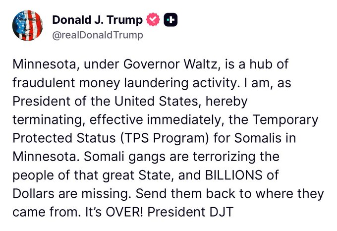 “Minnesota, under Governor Waltz, is a hub of fraudulent money laundering activity. I am, as President of the United States, hereby terminating, effective immediately, the Temporary Protected Status (TPS Program) for Somalis in Minnesota. Somali gangs are terrorizing the people of that great State, and BILLIONS of Dollars are missing. Send them back to where they came from. It’s OVER! President DJT”