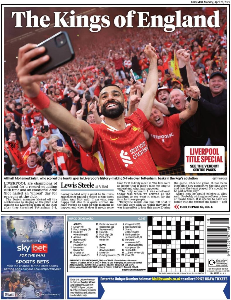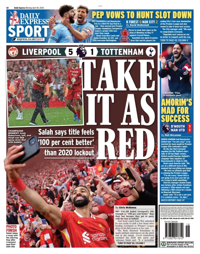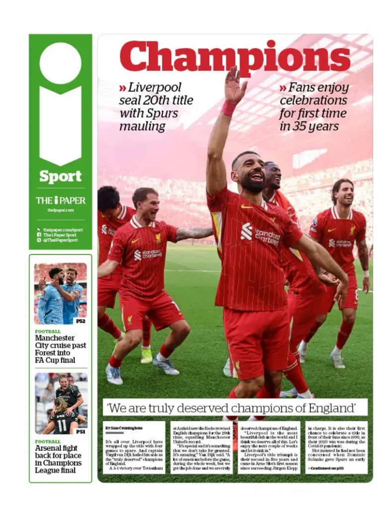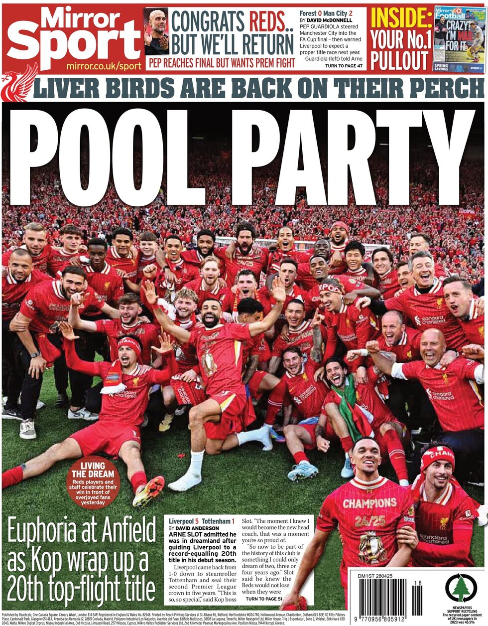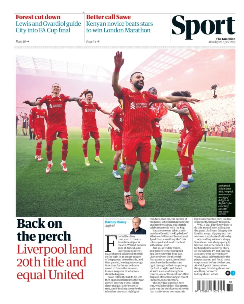 SPORTS COVERS: Liverpool are PL Champions April 28, 2025 Share: England’s newspapers cover Liverpool’s glorious day winning the Premier League title Bookmark this story Save For Later Join Our Community to get Live Updates Join our WhatsApp Channel Follow our Telegram Channel Related Posts Liverpool snap up Jeremie Frimpong from Leverkusen in £29.5m deal Diogo Jota’s funeral begins tomorrow as body returns to Portugal after fatal crash Salah mourns Jota’s death, says he fears Liverpool return