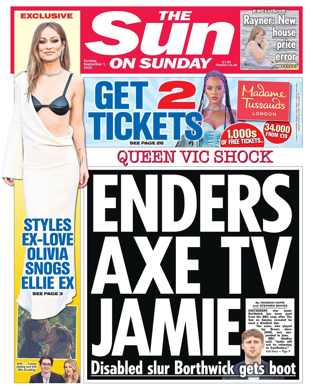 The Sun on Sunday splashes on news of EastEnders dropping star Jamie Borthwick from the popular soap after the paper claimed he used a disabled slur.