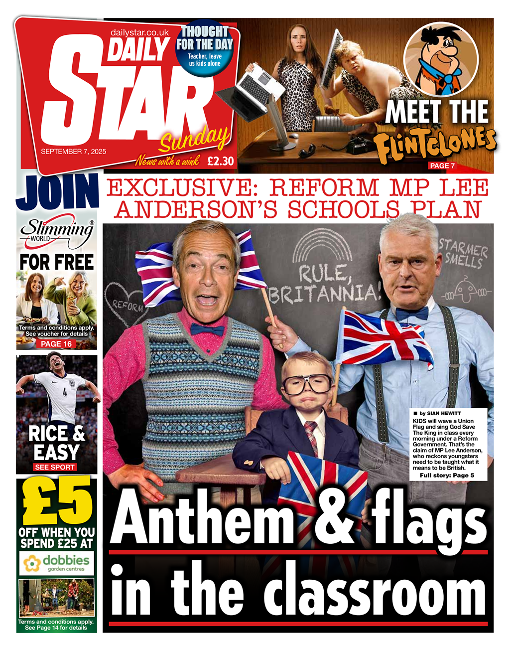 Reform MP Lee Anderson plans to have kids wave a Union flag and sing God Save the King in class every morning under a Reform government, the Daily Star says.