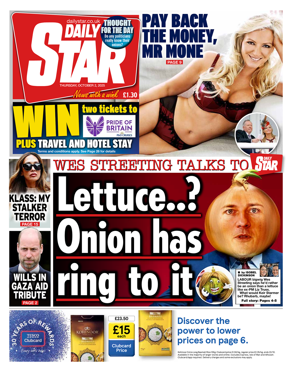 The Daily Star goes with comments by Health Secretary Wes Streeting about vegetables and Liz Truss.