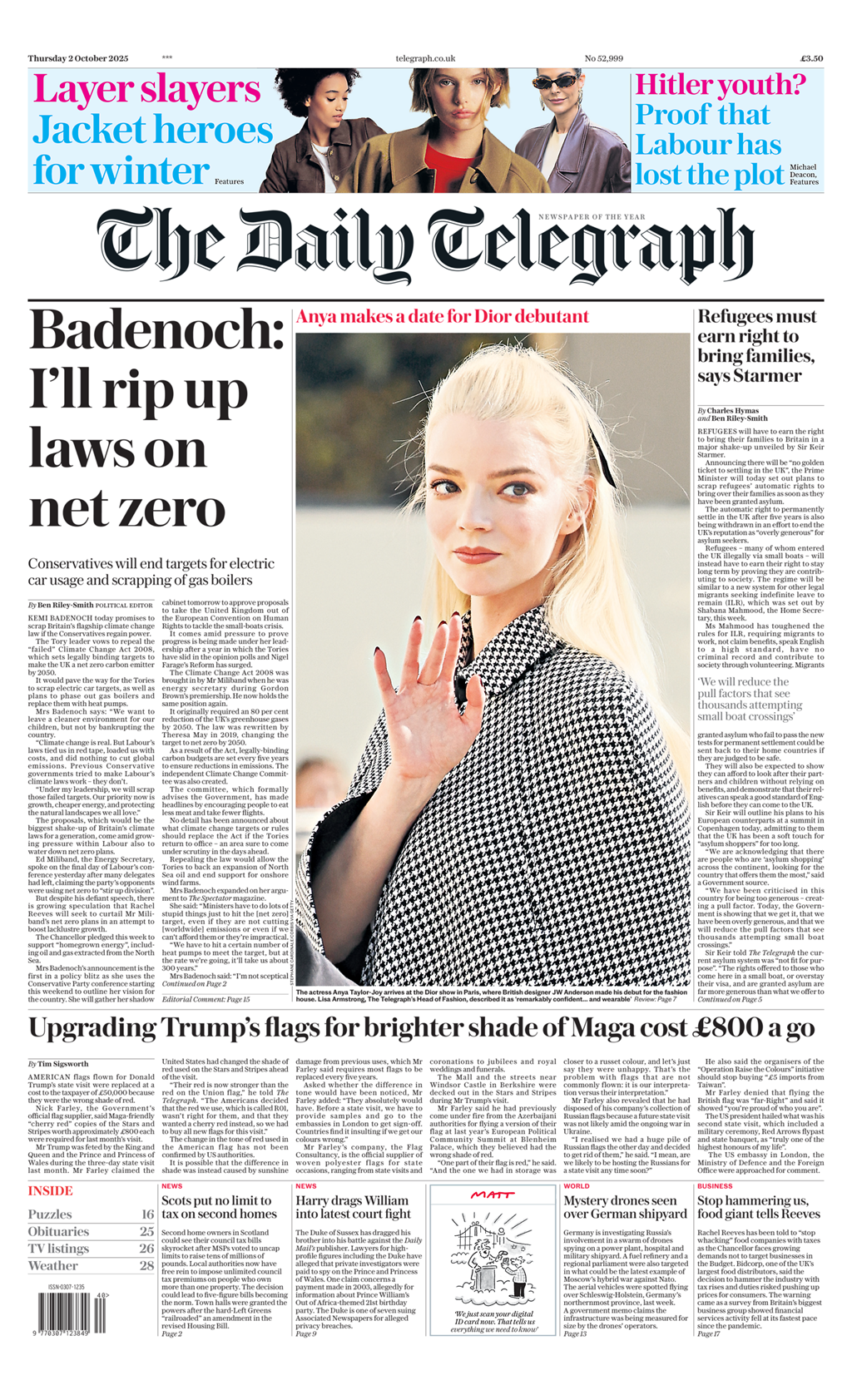 A promise by Tory leader Kemi Badenoch to roll back laws designed to help the UK achieve net zero is the lead in The Daily Telegraph.