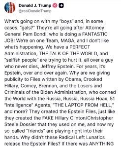 What’s going on with my “boys” and, in some cases, “gals?” They’re all going after Attorney General Pam Bondi, who is doing a FANTASTIC JOB! We’re on one Team, MAGA, and I don’t like what’s happening. We have a PERFECT Administration, THE TALK OF THE WORLD, and “selfish people” are trying to hurt it, all over a guy who never dies, Jeffrey Epstein.