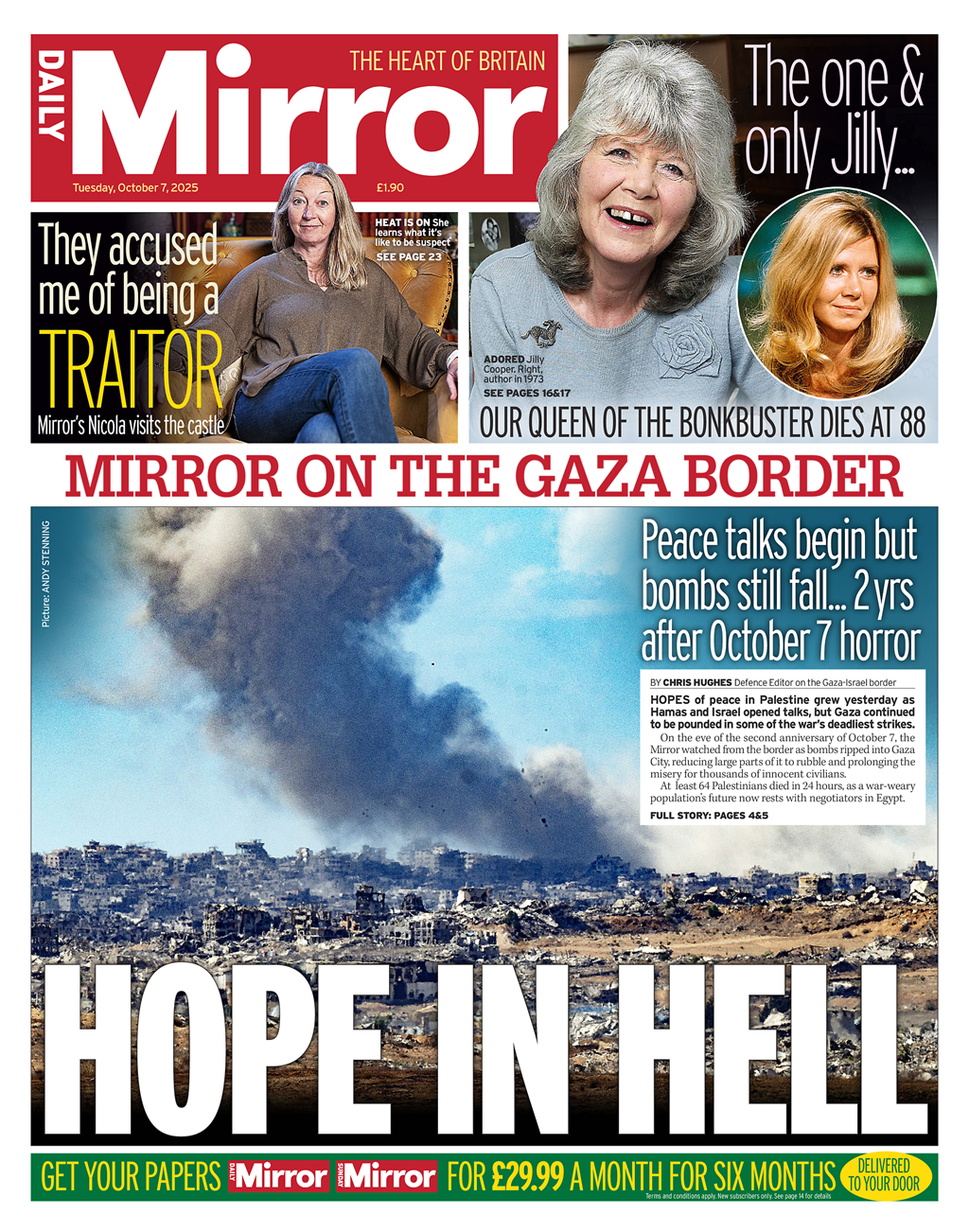 The Daily Mirror’s top story is the second anniversary of the 7 October 2023 Hamas raid on Israel that initiated the deadly conflict in Gaza.