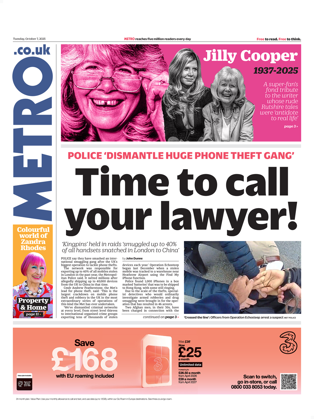 Police have broken up an international criminal network behind 40% of mobile phone thefts in London last year – that’s the lead story in the Metro.