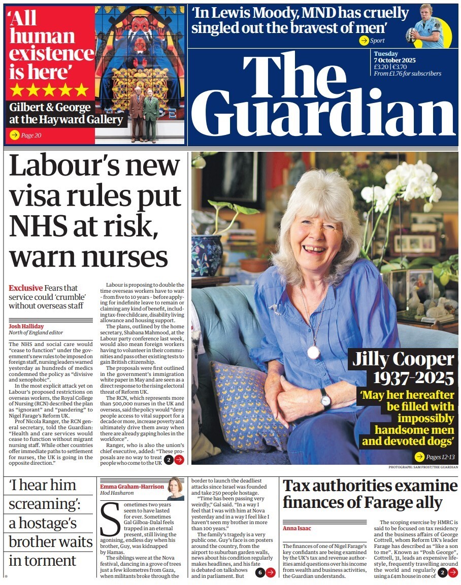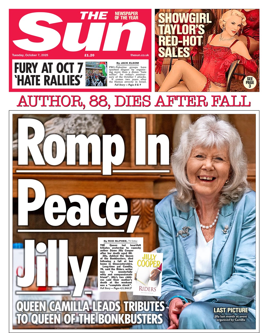 The Sun leads on the death of Dame Jilly Cooper, saying the Queen led tributes to the bestselling author.