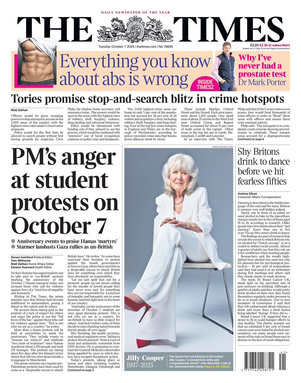 Sir Keir Starmer is calling on British students not to take part in “un-British” protests on the second anniversary of the Hamas attack on Israel that led to the Gaza conflict – that’s the lead in The Times.