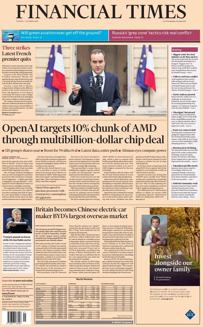 The Financial Times leads on plans by OpenAI, the maker of ChatGPT, to buy tens of billions of dollars’ worth of chips from chipmaker AMD and, in time, potentially take a 10% stake in the firm.