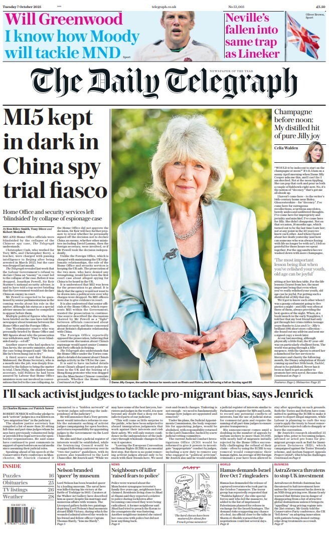 The Daily Telegraph leads on the collapse of a Chinese spying case, which was a surprise to both the Home Office and MI5, the paper says.