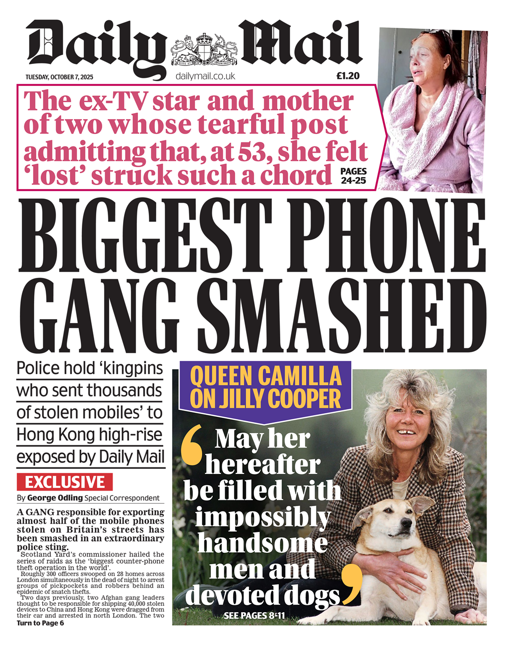 The Daily Mail leads on how UK police smashed a gang of international phone thieves.