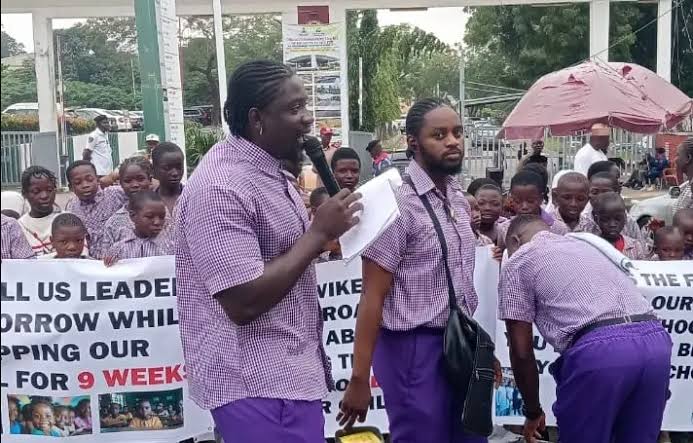 Dressed in school uniform alongside schoolchildren, VDM conducted a mock class outside the minister’s office. “S for Suegbe, T for Tinubu, W for Wike,” he recited, with pupils echoing.