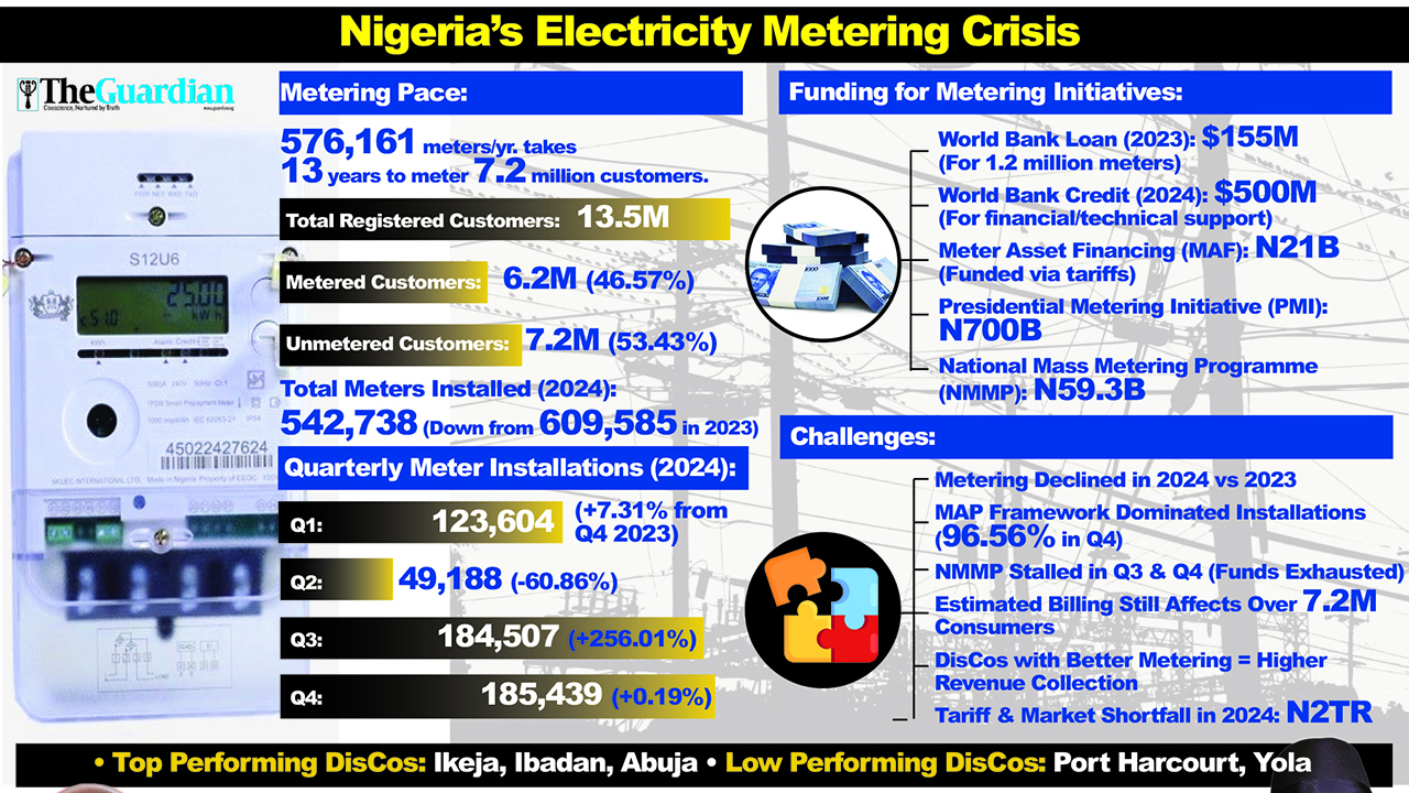 Nigeria’s power sector faces a prolonged metering crisis, with DisCos managing only 542,738 installations in 2024—down from 609,585 in 2023—leaving 7.2 million households without meters. NERC data shows over 53% of registered users still endure estimated billing, a system widely condemned as unfair. If the current pace persists, bridging the gap could take 11 years, costing consumers N1.4 trillion.