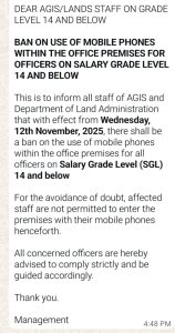 The directive, contained in an internal memo issued by AGIS Head Chijioke Nwankwoeze, prohibits officers on Salary Grade Level 14 and below from entering office premises with their mobile phones starting Wednesday, November 12, 2025. “There shall be a ban on the use of mobile phones within the office premises for all officers on Salary Grade Level (SGL) 14 and below,” the memo read in part.